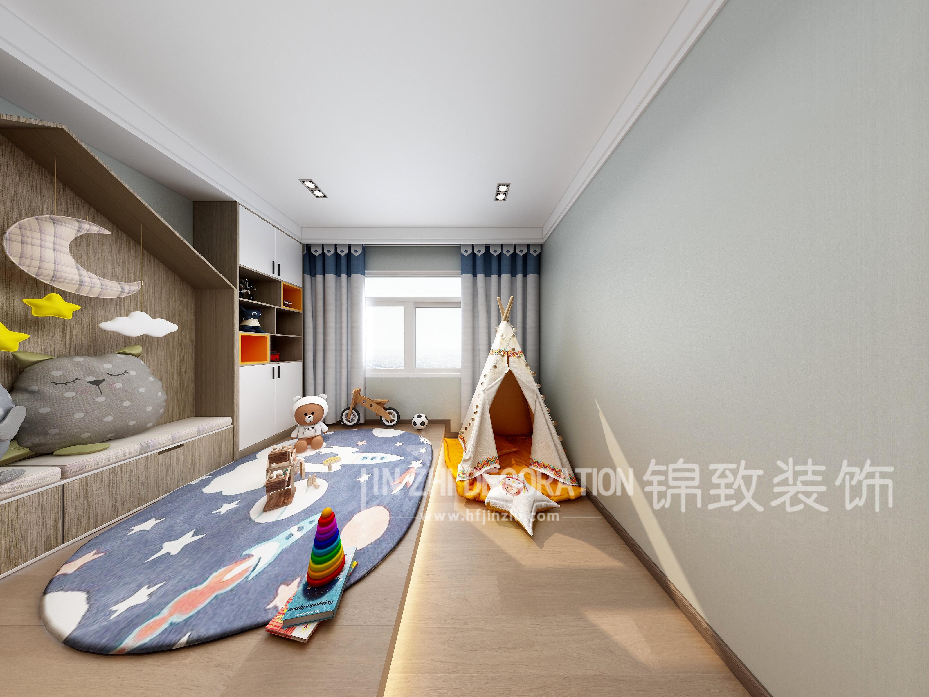 玩具房的设计以儿童乐趣为主,两边壁柜增加储物空间,镶嵌房屋型壁柜,可做沙发休闲区,提供休息,以娱乐为主。地面是玩具区,来客人也可铺设榻榻米供客人休息。乐趣十足。整屋无主灯设计,抬高地面在地板下做地台直线反光灯带,光线柔和,设计感强。